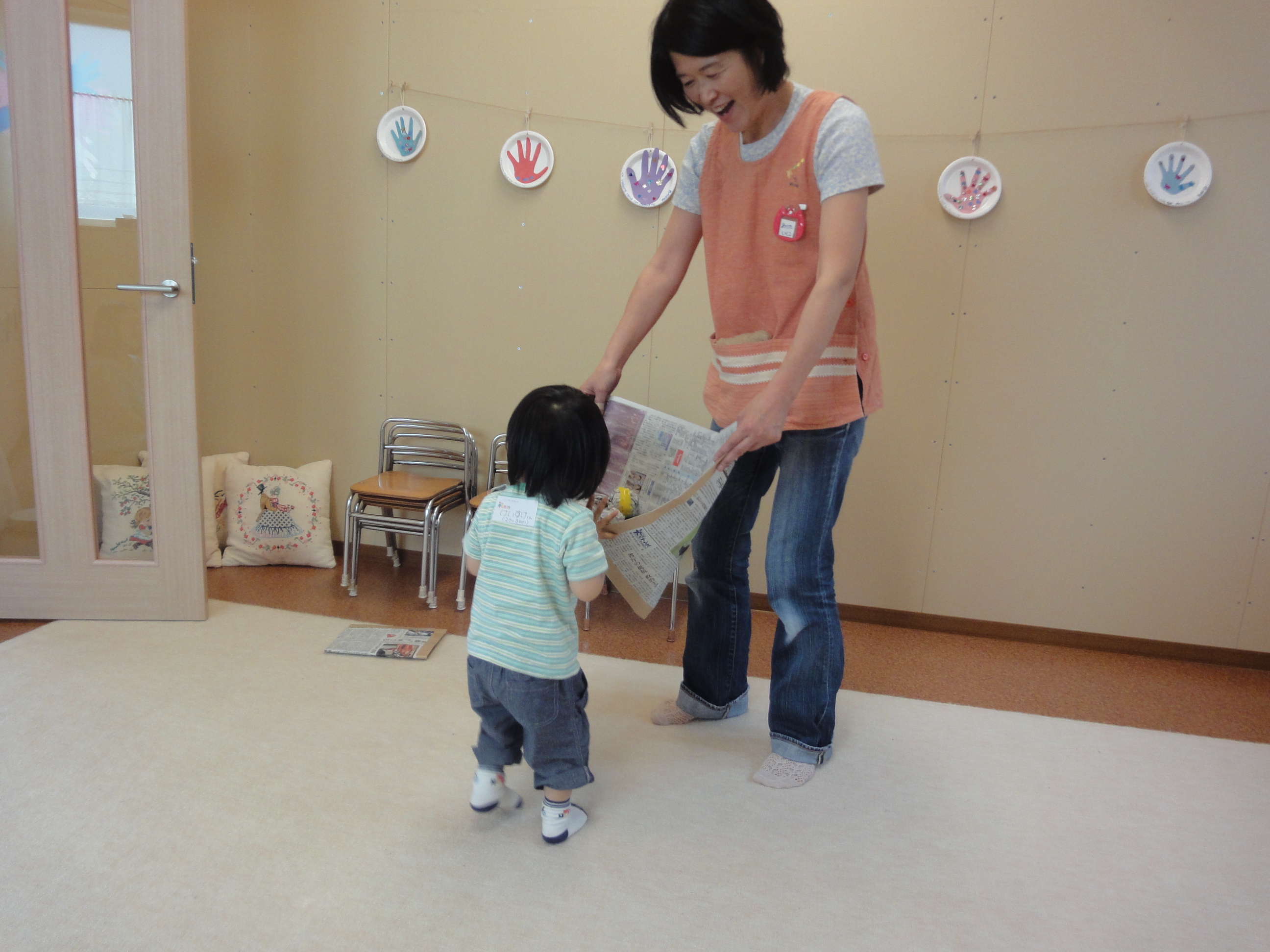 今回は、新聞紙遊びをしました。新聞を丸めてくしゃくしゃにしたり、びりびりに破いたり、丸めた新聞にビニールテープをくっつけてボールにしたり、新聞を縦長に丸めて棒状にしてからビニールテープでくっつけてバットにしたり、トイレットペーパーの芯の端に四つ切り目を入れて段ボールにテープでくっつけて、新聞紙バットをそこに差し込んだり、また、それの上に丸めた新聞ボールをのっけて、もう一つの新聞紙バットでそのボールを打ったり、長細く丸めた新聞紙の端と端をビニールテープでくっつけて輪投げにしたり車のハンドルにしたり、新聞紙の上に子どもを乗せてあげてゆらゆら動かしてあげたり。。。さまざまな顔を持つ新聞紙。ママもこんなに身近なものでこんなに楽しめるんですねぇ!と感心していましたよ。